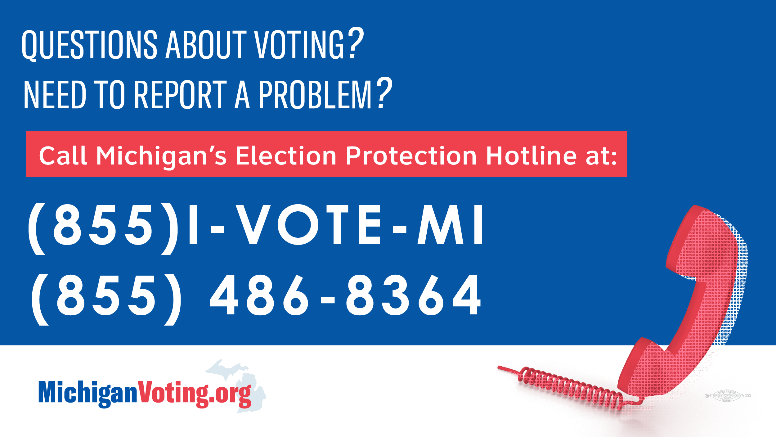 Questions about voting? Need to report a problem? Want some expert advice? Call Michigan’s Election Protection! The nonpartisan Election Protection Hotline has got you covered. Call (855) I-VOTE-MI |